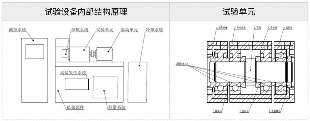 試驗機結構原理圖,包含機架部件、試驗單元、驅動系統、徑向加載系統、軸向加載系統、潤滑系統、冷卻系統、高溫發生系統、測控系統等部件組成。